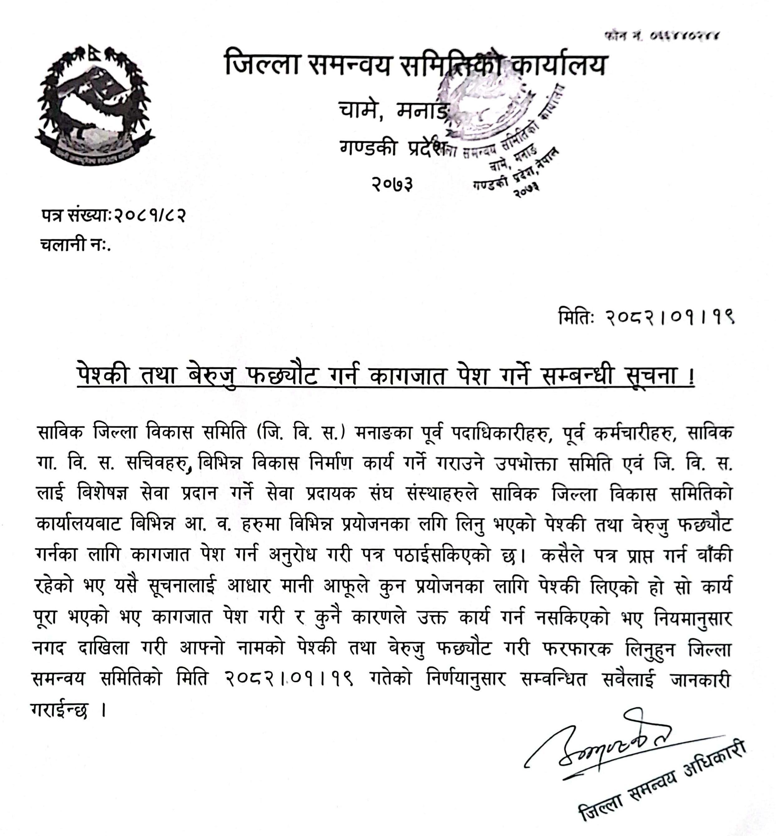 - बेरुजु फस्यौट सम्बन्धी मिति २०८२ जेठ ११ गते आइतबार १४:४८:५३ बजे (जिल्ला समन्वय समिति मनाङ)